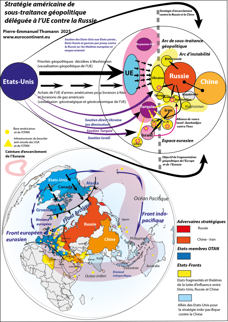 Les Etats européens de la coalition de volontaires (Paris, Londres, Berlin, Varsovie) qui cherchent à envoyer des troupes d’interposition en Ukraine sont en pointe pour porter la sous-traitance géopolitique de Washington, puisqu’ils visent à remplacer les Américains sur un mode tactique (des unités militaires supplétives) mais selon les priorités géopolitiques de Washington, c’est à dire le contrôle et l’élargissement du Rimland, sous-élément de la stratégie géopolitique de fragmentation et d’encerclement de l’Eurasie. C’est l’inverse de l’autonomie stratégique européenne car la vassalisation géopolitique des européens de l’UE se renforce en réalité selon ce schéma, faute de doctrine géopolitique indépendante de la part des Européens et qui les place les Européens comme acteurs secondaires et disqualifiés pour une négociation avec Moscou. L’impossibilité de l’élargissement de l’OTAN et l’accélération du monde multicentré qui écarte le rêve unipolaire américain dans lequel l’UE cherchait à se positionner, mais les gouvernements vassalisés poursuivent les doctrines géopolitiques anglo-saxonnes obsolètes car elles ont échoué à préserver le monde unipolaire, et fait d’eux la variable d’ajustement du nouvel ordre spatial et géopolitique, tandis que Washington masque ainsi son incapacité à faire plier la Russie.