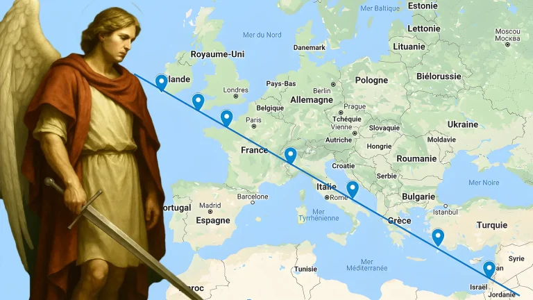 L’ « Épée de Saint-Michel » est une séquence de sept sites dédiés à l’archange Michel, figure emblématique de la lutte contre le mal dans la tradition chrétienne. Selon la légende, cette ligne symbolise le coup d’épée que Saint Michel porté au diable — qui se « plante » en Israël —, le précipitant dans les profondeurs de l’enfer. Mais au-delà de l’aspect religieux, les faits géographiques et historiques révèlent une réalité stupéfiante.