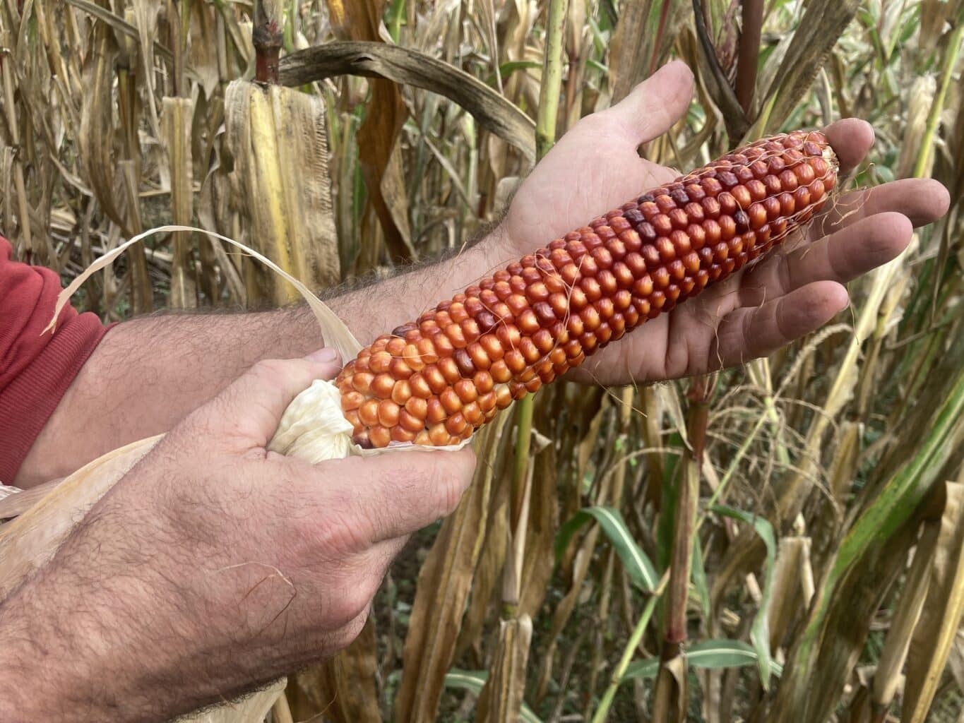 C’est un formidable hasard qui lui apporte la solution. Un de ses collègues a retrouvé, caché au fond d’un tiroir d’un monastère, une variété de maïs paysan endémique : le Grand Roux Basque. Sa grande diversité génétique se reflète dans l’éventail de couleurs de ses épis, allant du jaune or au rouge bordeaux.