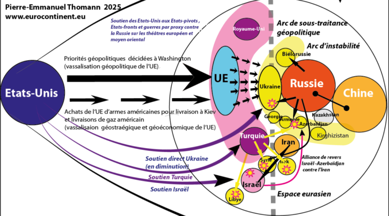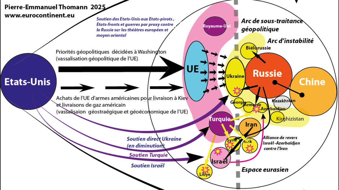 La sous-traitance géopolitique est la nouvelle doctrine de Washington, qui cherche à déléguer la responsabilité du conflit en Ukraine aux Européens de l’OTAN et de l’UE, tout en continuant à imposer ses priorités géopolitiques. A Washington, la tête du pôle impérial euro-atlantiste, la Grande Stratégie géopolitique, à l’UE, le supplétif de l’empire, les objectifs tactiques de cette stratégie. Washington n’a donc pas abandonné Kiev, mais comme ses livraisons d’armes, de renseignements et de fonds s’amenuisent, les Européens de l’OTAN et de l’UE sont censés assumer de plus en plus ce rôle et jouer un rôle de plus en plus important. Il s’agit donc d’un projet de vassalisation géopolitique intégrale des supplétifs européens géopolitique, géostratégique et énergétique puisqu’elle se coule dans la doctrine géopolitique américaine de sous-traitance, avec achats croissants d’armement américain pour les transmettre à Kiev et importations du gaz et du pétrole américain.